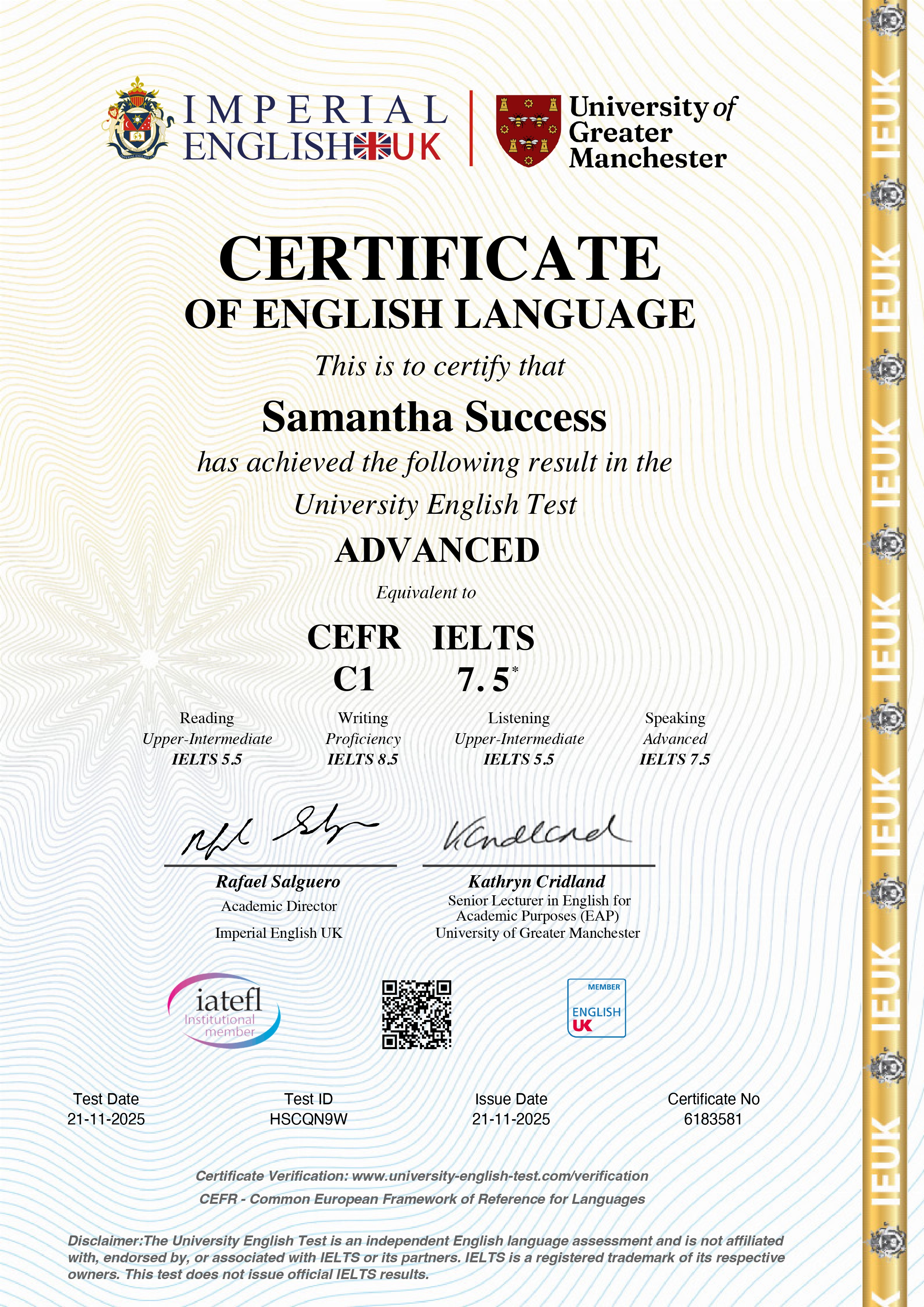 The University of Greater Manchester, in collaboration with Imperial English UK, now offers you a simple and convenient pathway to meet the University’s English language admission requirements.